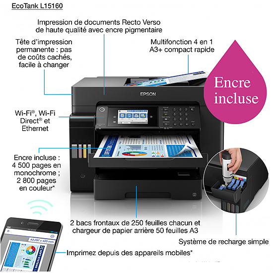 Imprimante ECOTANK L15150 Multifonction 4 en 1 Recto Verso Automatique A3+ (copy scan print fax)