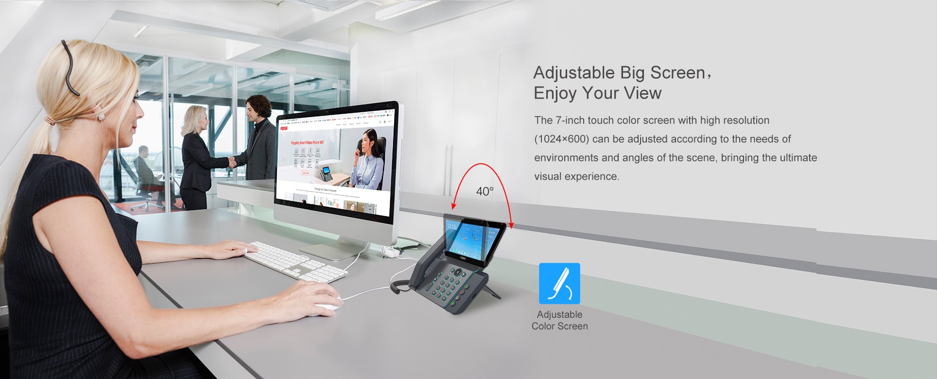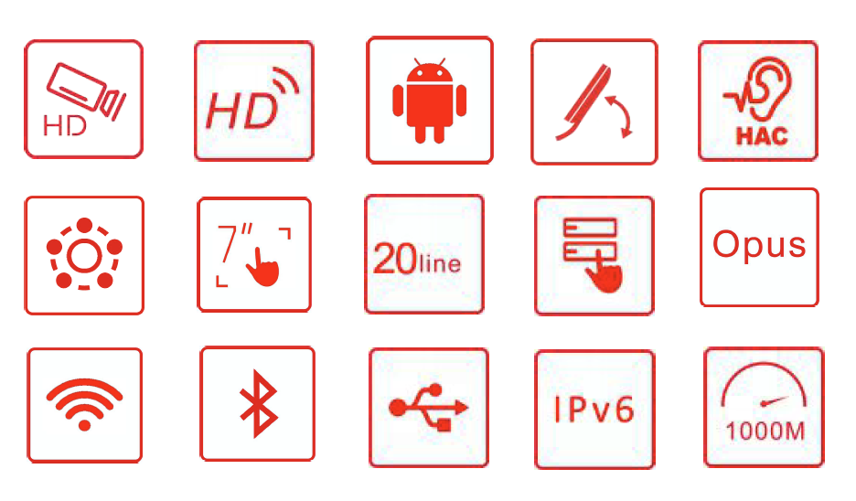 20 lignes SIP, Voix HD, Prise en charge des appels vidéo haute définition (720P/1080p), PoE,cran tactile couleur de 7 pouces (1024x600),Mode téléphone portable/mains libres/casque, Touches DSS intelligente (bouton virtuel),Alimentation externe en option