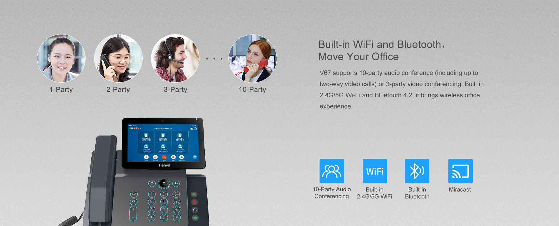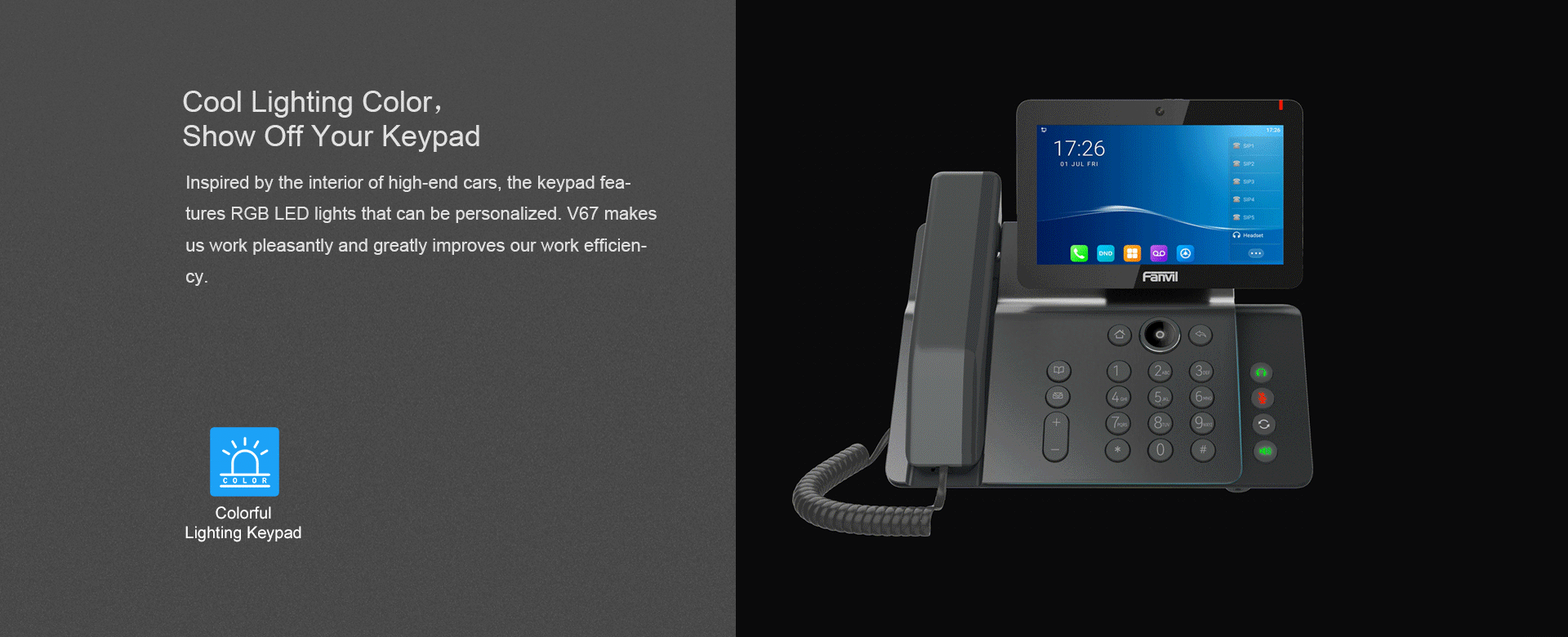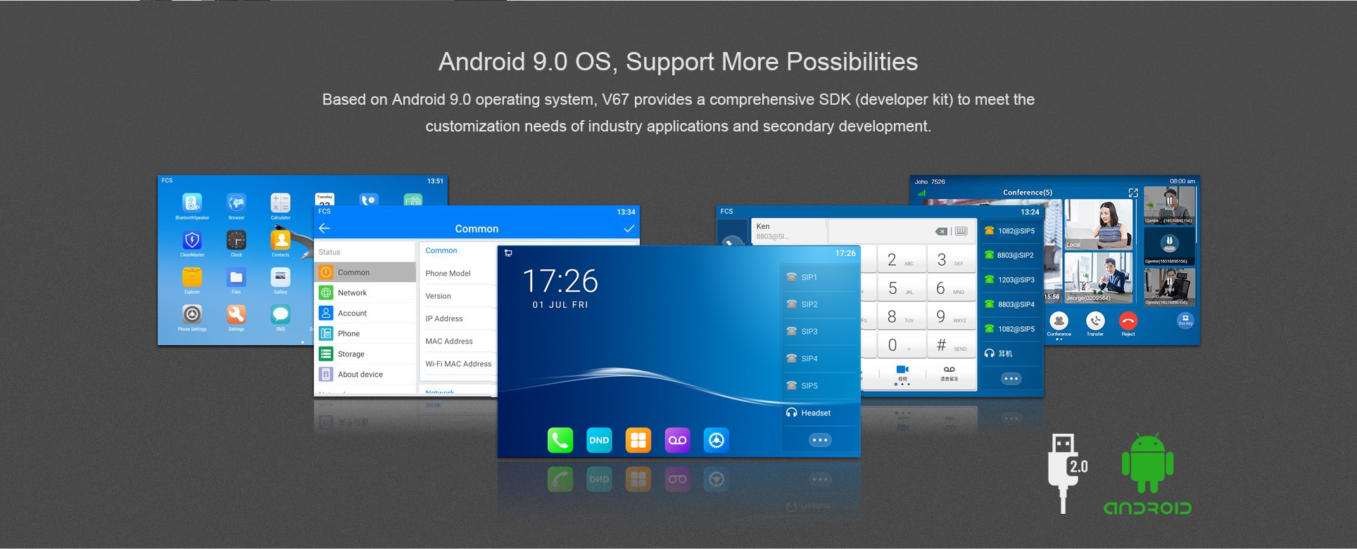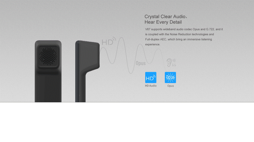 En tant que téléphone IP d'entreprise haut de gamme avec système Android 9.0, le V67 offre aux utilisateurs une expérience tactile plus intelligente et plus fluide. 112 touches programmable sur l'écran tactile couleur de 7 pouces, WiFi et Bluetooth intégré rendent les communications quotidiennes plus intelligentes et plus simples.