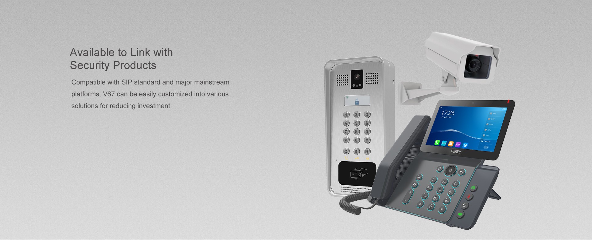 Téléphone vidéo IP Haut Gamme Ecran Tactile 7" 20 Lignes SIP Bluetooth Intégré 116 touches programmables. En tant que téléphone IP d'entreprise haut de gamme avec système Android 9.0, le V67 offre aux utilisateurs une expérience tactile plus intelligente et plus fluide. 112 touches programmable sur l'écran tactile couleur de 7 pouces, WiFi et Bluetooth intégré rendent les communications quotidiennes plus intelligentes et plus simples.