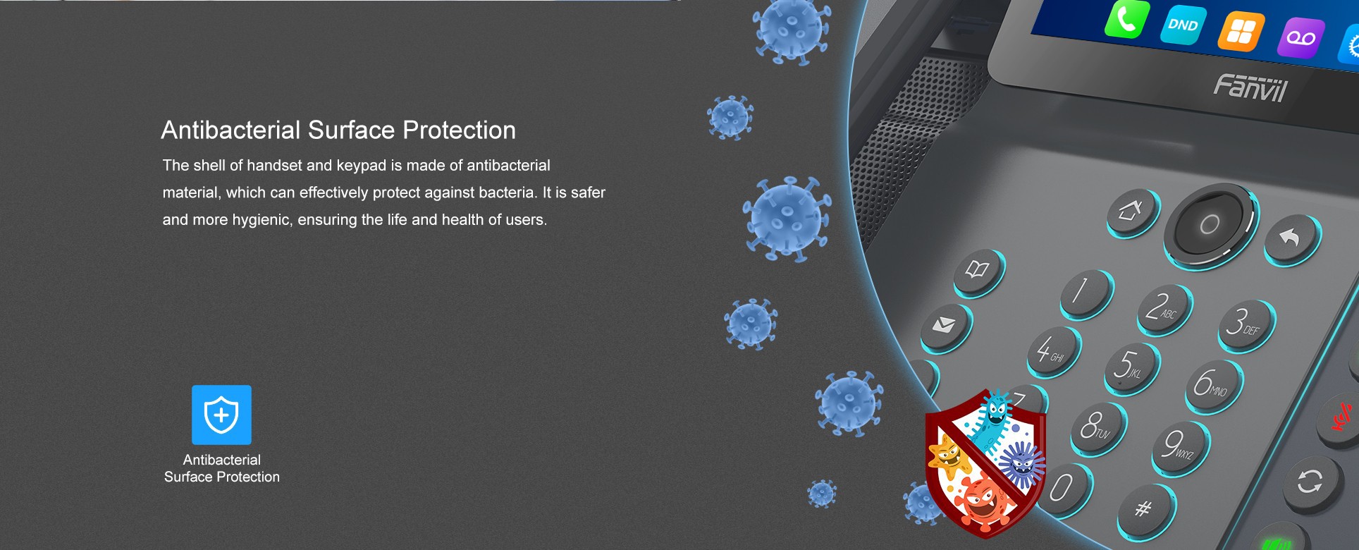 • Le matériau antibactérien du combiné et de la surface du clavier inhibent efficacement plus de 99,5 % de la croissance des bactéries.