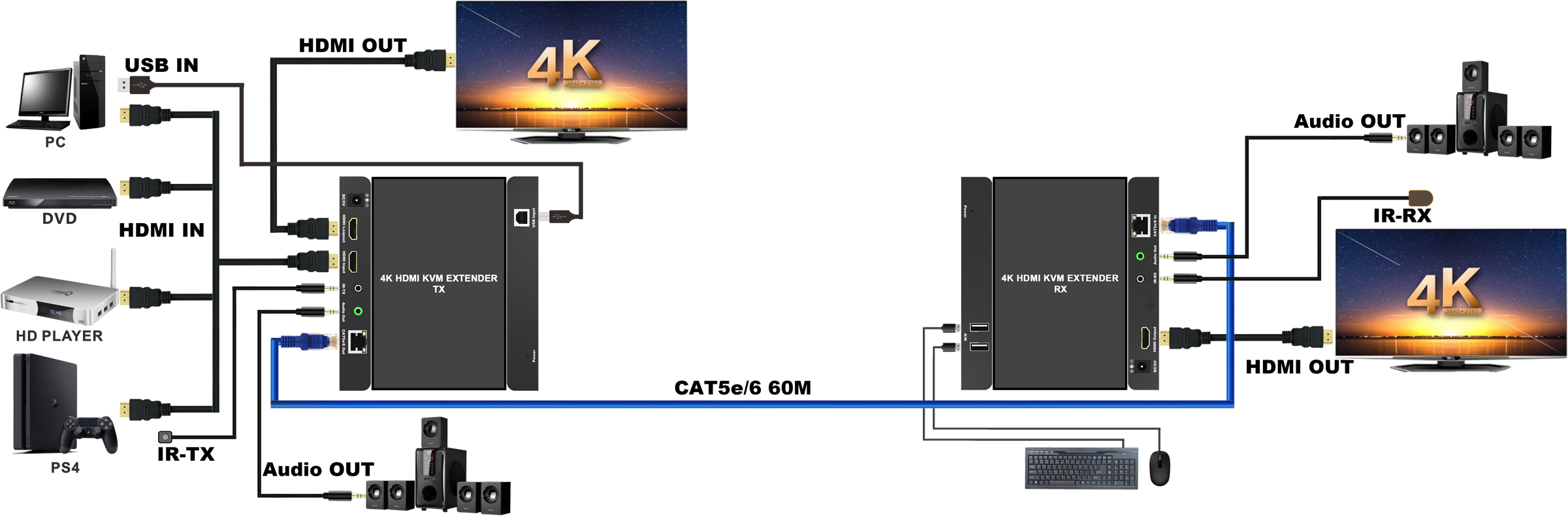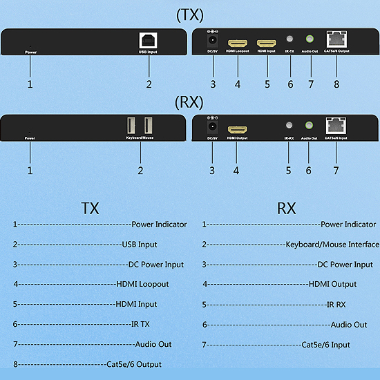 1. transmission du Signal: câbles CAT5e/6 (recommandé) jusqu'à 60 mètres au lieu de câbles HDMI sont connectés entre TX et RX Extender.