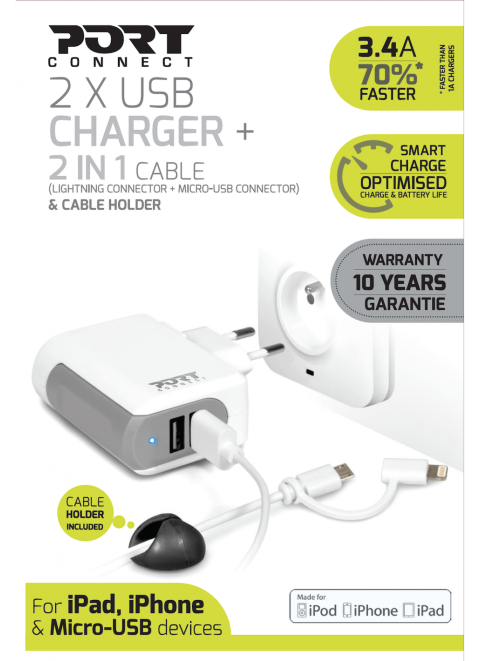Port Designs 900023 - PORTDESIGN CHARGEUR VOITURE 2 USB & 2IN1 - EU