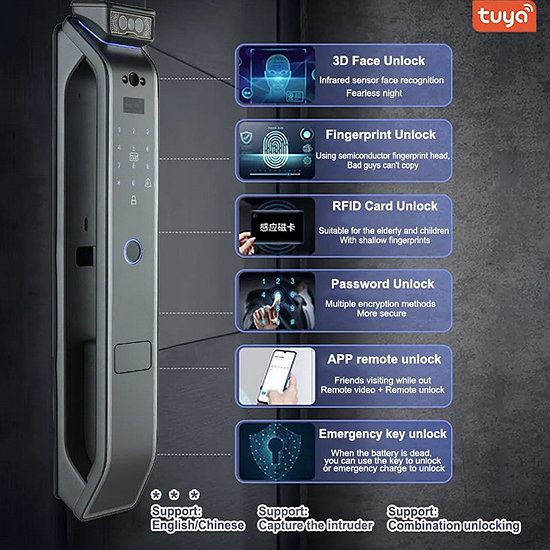 • Déverrouillage Methode : 3D Face (Caméra Intégré ), Application Mobile Wifi , Mot de passe, Empreinte, Carte RFID, Clé Manuel , Port USB.