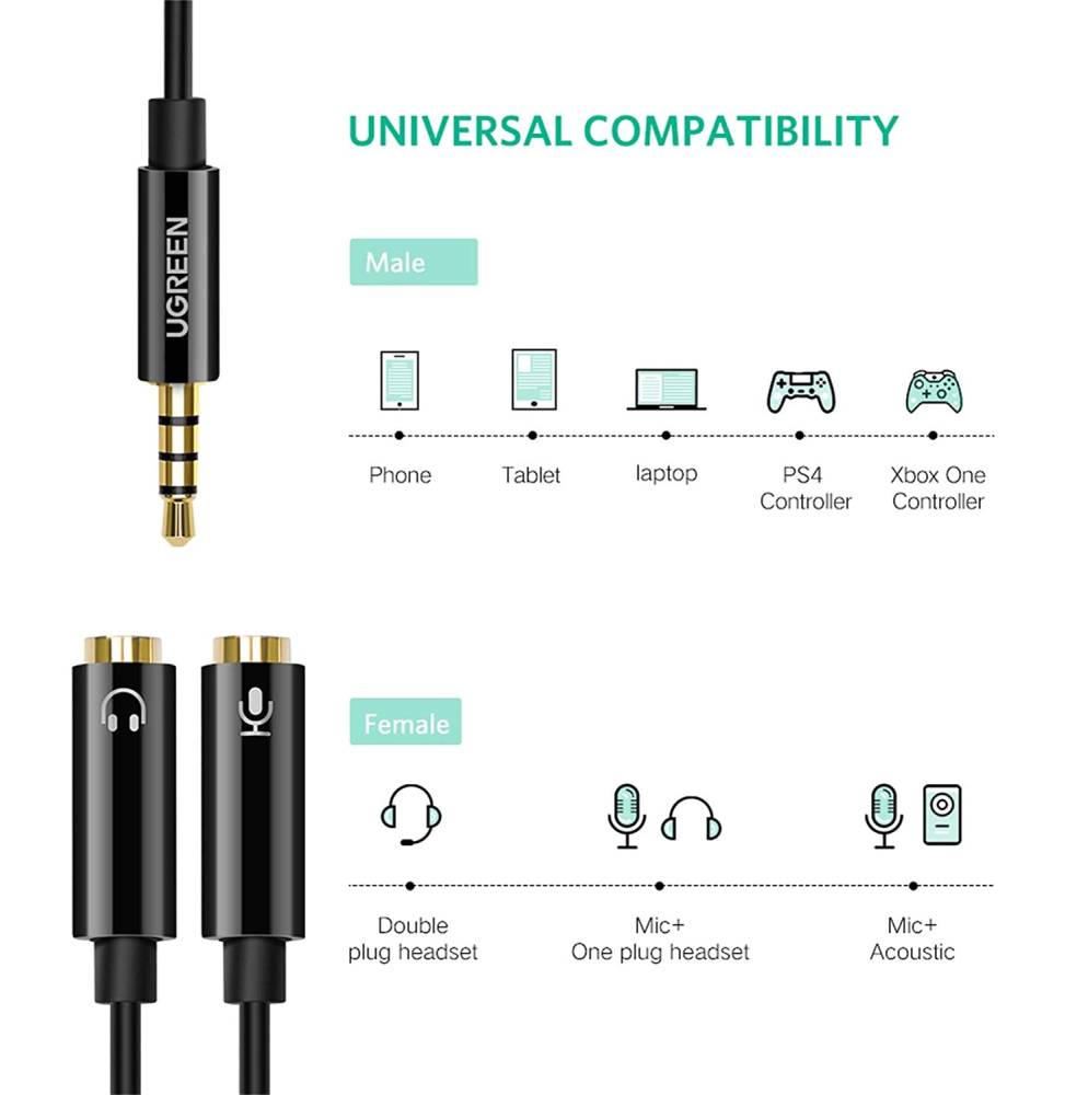 Ugreen 30620 - Répartiteur Audio Ugreen 3,5 mm Mâle vers 3,5 mm Femelle
