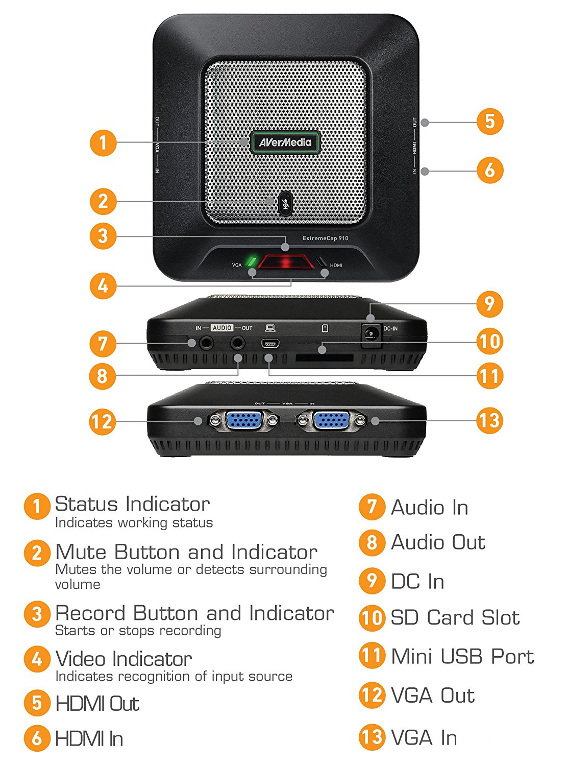 ExtremeCap 910 offre USB 2.0 (mini USB), entrée HDMI, VGA, jack 3,5 mm et HDMI, VGA, jack 3,5 mm. Il y a aussi un emplacement pour les cartes mémoire SDHC qui sert de stockage. Les dimensions de la boîte sont 125,4 x 34,6 x 125 mm et pèsent 170 g.