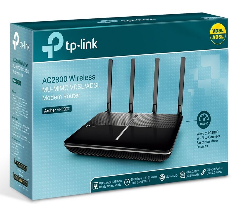 Routeur Wi-FI CA 2800 Mbps VDSL/ADSL/Fibre/FTTH Dual-Core Le VR2800 plus rapide des modems routeurs VDSL, Débits de 2167 Mbps en 5 GHz et 600 Mbps en 2.4 GHz 802.11ac Wave 2, La dernière génération de Wi-Fi inclus MU-MIMO et bande passante en 160 MHz, CPU dual-core 1 GHz, Le processeur dual-core Broadcom 1 GHz est équipé de 2 co-processeurs, Application TP-Link Tether Pour installer et administrer le Archer VR2800 depuis un appareil Android ou iOS